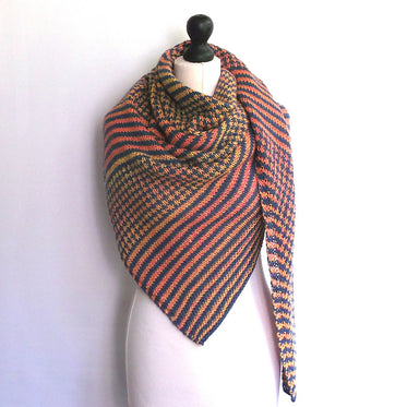 This triangle shawl is worked in two contrasting shades of yarn. Bands of color are created using stocking stitch stripes and a slip stitch pa...