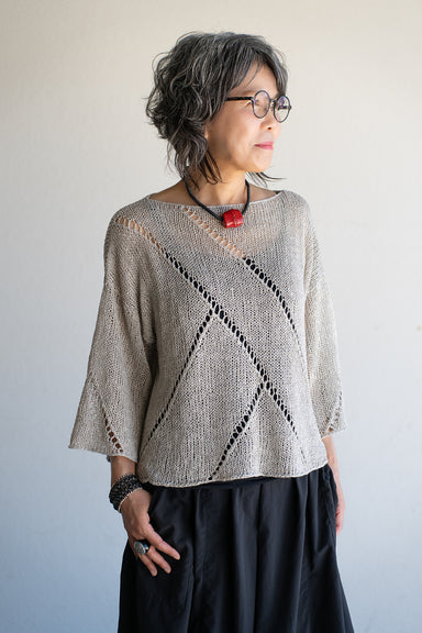 This top is fun to knit. Markers, yarn overs, and decreases create lines of moving eyelets. You’ll enjoy working these eyelets combined with stock...