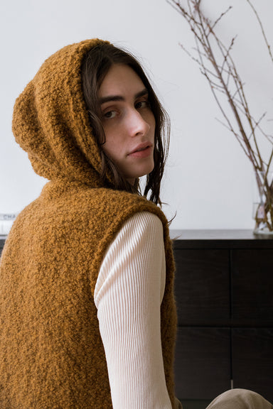 Layer this versatile hooded piece under coats or over sleeves, perfect for winter into spring!Vest is worked in the round from the lower edge to t...