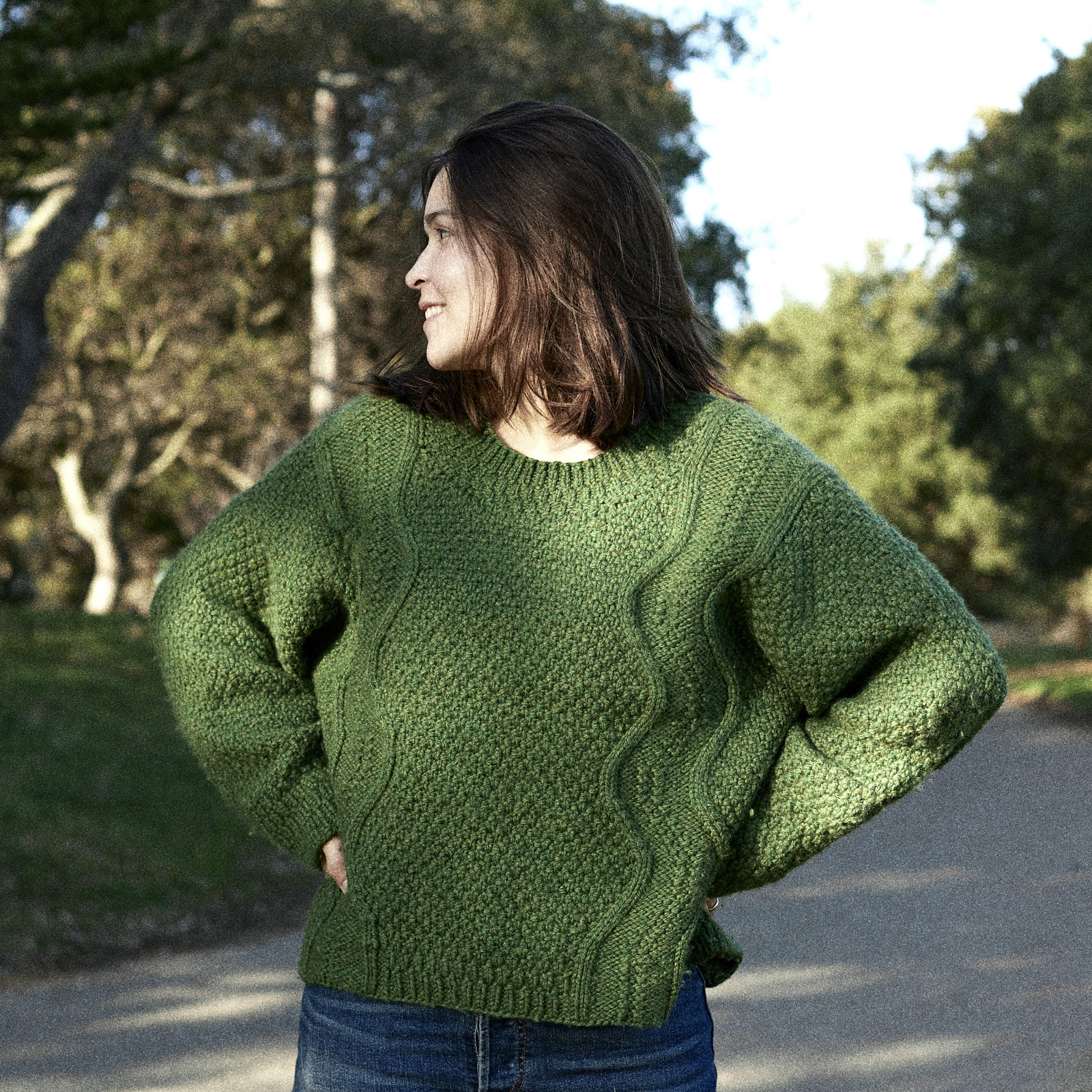 The Bike Path Sweater is knit top-down with a drop shoulder construction. It features dramatic cabled bike paths, grass-like moss stitch, and unique gradient ribbing at the hems. This pattern has been tech edited and test knit in all sizes.