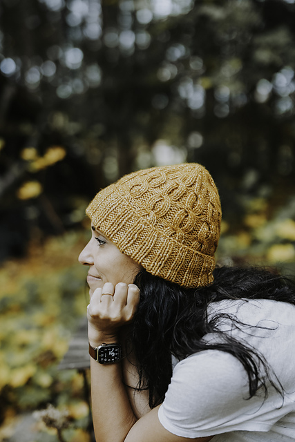 The Twisted Affair beanie by Joji Locatelli is worked from the bottom up. It features a ribbed brim, and cables all over the body of the hat.