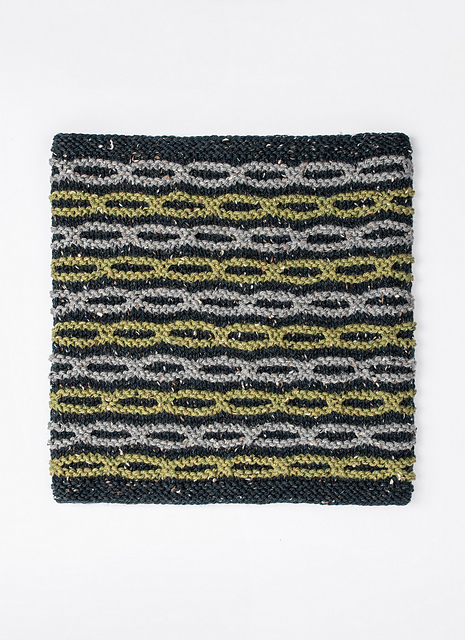 The Chain of Lakes Cowl by Bobbi IntVeld is knit in the round with Woolstok Tweed and uses a fun chain stitch. This colorful and warm cowl is a quick knit.