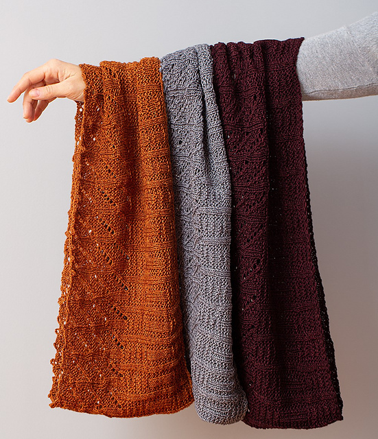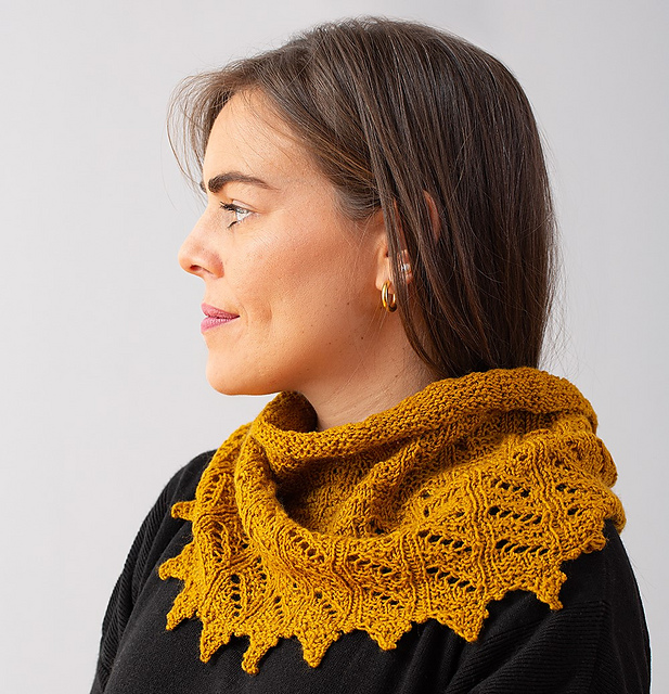 The Deco Cowl by Catherine Salter Bayar is a 1-skein cowl in two sizes and two bind off options. Inspired by the static geometric and streamline motifs of the Art Deco era, three stitch motifs align in a rigid square structure that flows into a diagonal double seed stitch eyelet lace.
