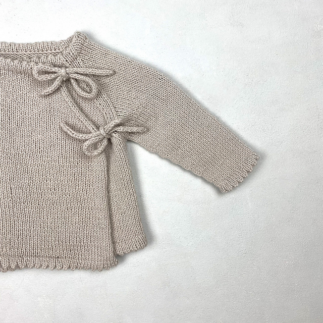 The sweater is finished adding either buttons and crocheted straps for button holes or knitting and attaching i-cord strings to keep the front pieces in place.