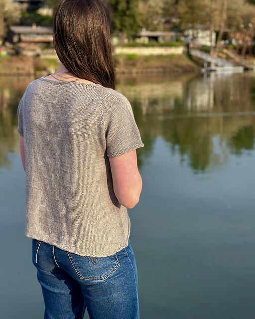 Pacific Crest Trail Tee by Kay Hopkins is a timeless V-neck pullover with a modern cable twist that is sure to become a wardrobe staple. This is wonderfully comfortable for warmer weather and you can choose longer sleeves for cooler weather too. Would you angle the hemline or make it straight?