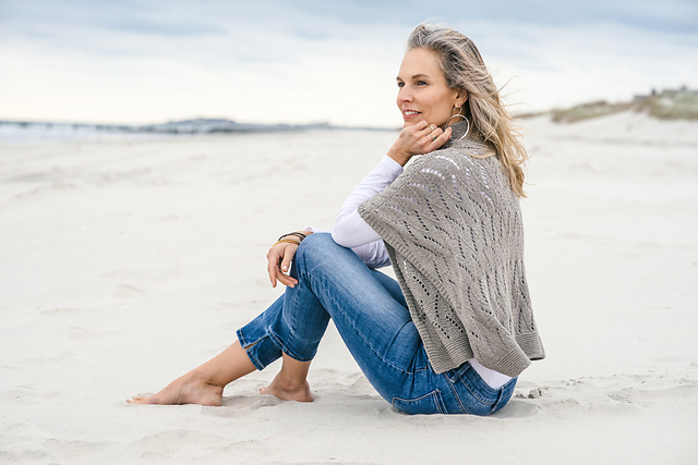 Stone Point is knit flat in two identical pieces. Once complete, the front and back are joined at the shoulders using a 3-needle bind off and the neckband is worked in the round. The garment is easily customizable; you may lengthen the piece by working additional repeats of the Flame Chevron Lace. At the specified gauge, each skein of yarn will work approximately 1.5 repeats (36 rows). You can add additional repeats for width by adding a multiple of 7 sts + 4 sts to the cast on number. Be sure to purchase enough yarn to accommodate your modifications. Unless otherwise noted, slip all markers as you come to them.