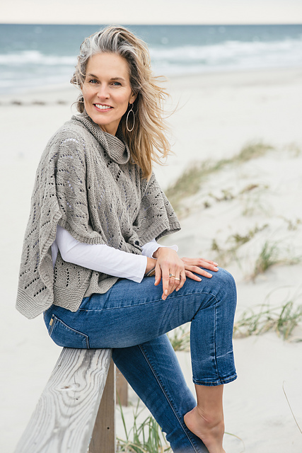 A note on gauge: The combination of the cotton content and the lacey stitch means that this fabric will grow considerably when blocked. BE SURE TO WET BLOCK YOUR SWATCH. I used 3 skeins to knit the front, 3 for the back, and the final (7th) skein to work the neck. The poncho will look short before you block it, but if you go by your blocked swatch gauge you will be a-okay.