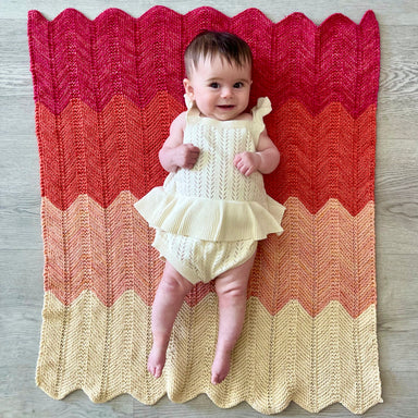 The Kim blanket by Ursula McGrath is knit using Juniper Moon Farm's buttery-soft Cumulus Rainbow and Cumulus solids. SKILL LEVEL: Beginner/interm...