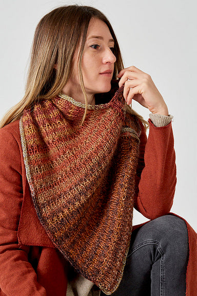 A simple rib lace rectangle in spiral curve layers of color and texture, combining self-striping yarn with lush mohair. Designed by Catherine Sa...