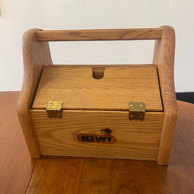 Upcycled vintage handled Kiwi shoe shine box with hinged flaps on both sides.Dean made a yarn bowl for his wife years ago and through trial and err...