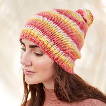 The Citrus Hat by Universal Yarn is a fun and spunky hat perfect for chilly days. This hat will provide a pop of colors that everyone is sure to love. Our Deluxe Stripes yarn does all the striping work for you and results in a gorgeous, colorful pattern, so you can relax while you knit.